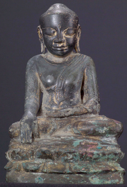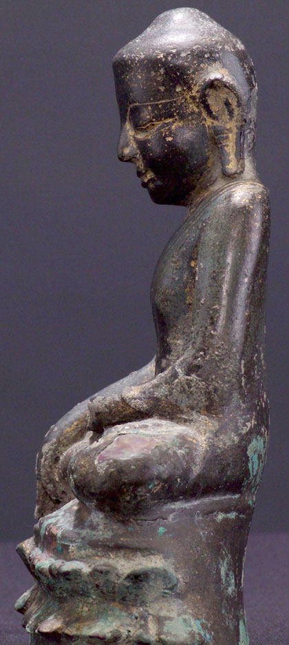 Very sweet Buddha from the 13/14th century in a transitional phase between the late Pagan period and the early Ava period. He still has many of the features of a Pagan style Buddha, but has begun to move from the pinched face of the Pagan style to the more rounded baby-like face of the Ava period. 6.5" tall. Extremely beautiful face, and a very rare Buddha.
