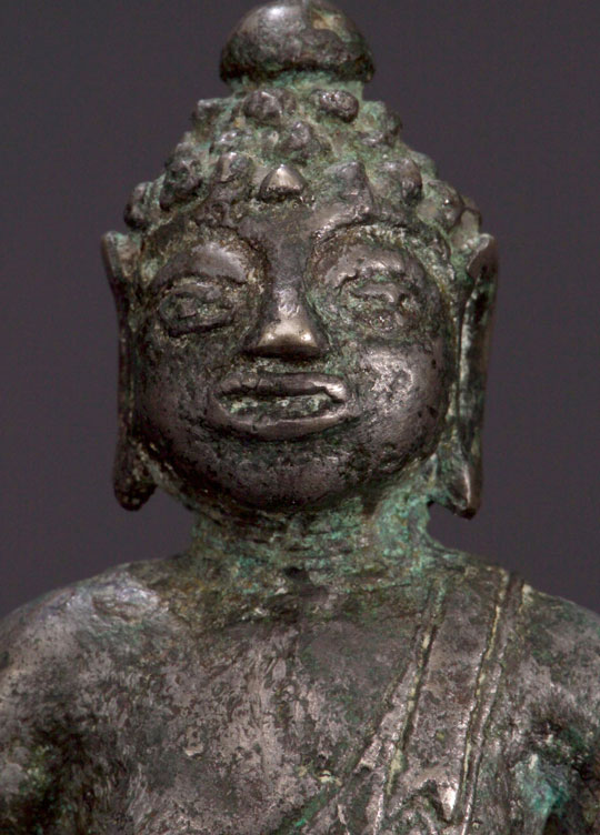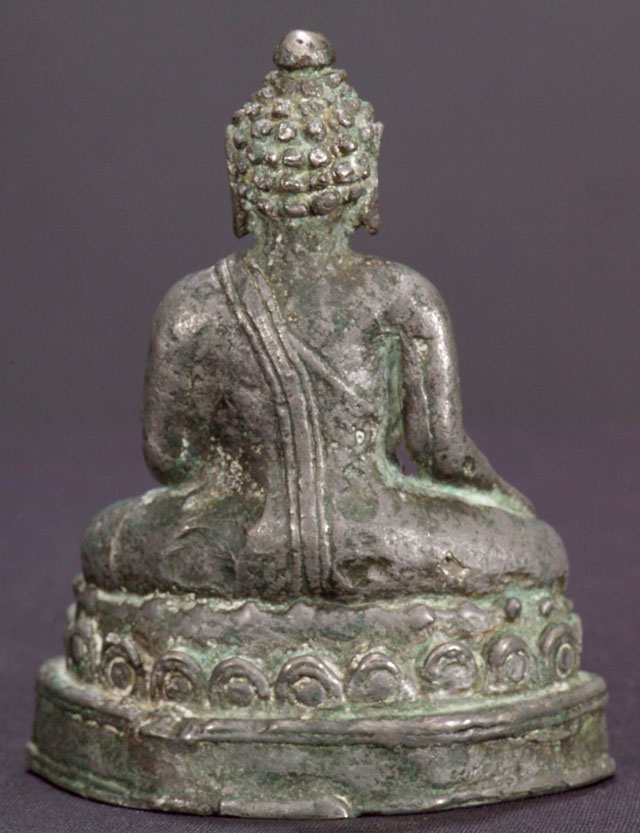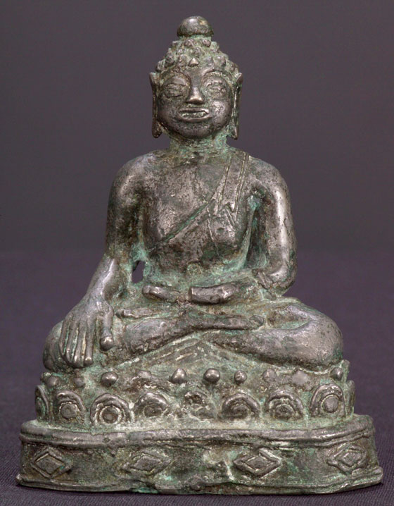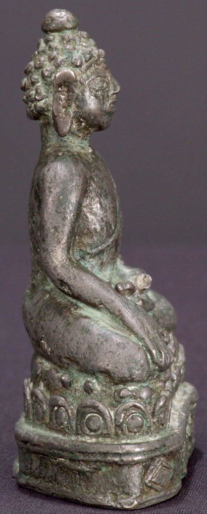 Fantastic thickly cast silver or silver alloy 16-/18th C Laos folk style Buddha. Very expressive, with a wonderful detailed base, he is folk art at its best. The style is 16thC, but Laos folk Buddhas emulated styles for long periods of time so he may be later. He is very old for sure, and of very high silver content. 4-3/8" tall, and extremely heavy for his size.