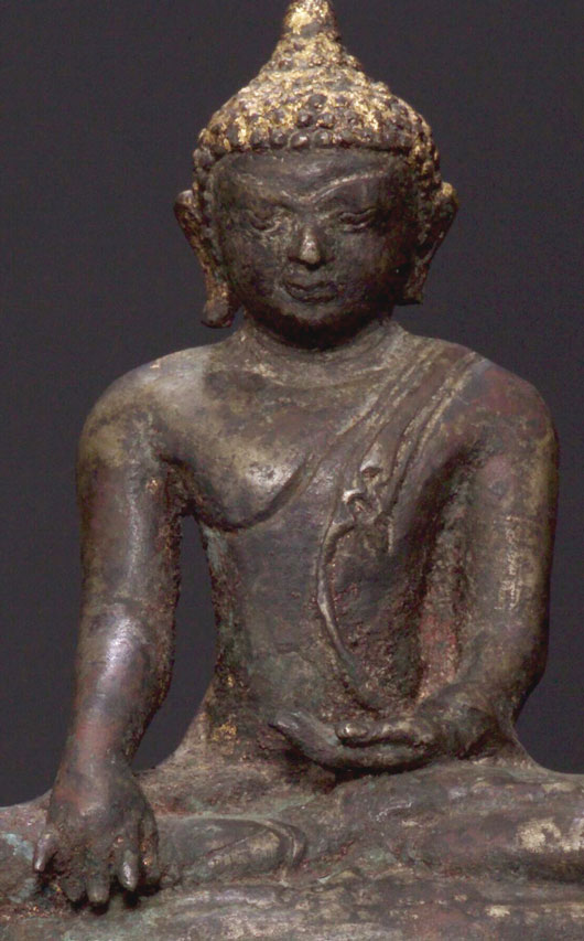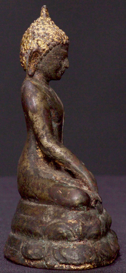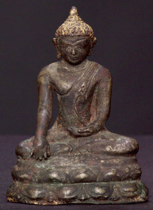 12thC Pagan Burmese Buddha- the real thing. With typical wear from 800 years of existence, he has the feel of deep devotion. He is complete, with all fingers (right had with fingers in a subtle Mudra)- only loss is to one earlobe. Cast out of a distinctive silver colored bronze alloy often used in Pagan times. He was covered with lacquer and gilding for many centuries- the hair still is fully covered- remnants are evident in other places- this is what protected him through the ages. A powerful fellow! Four and a half inches tall.