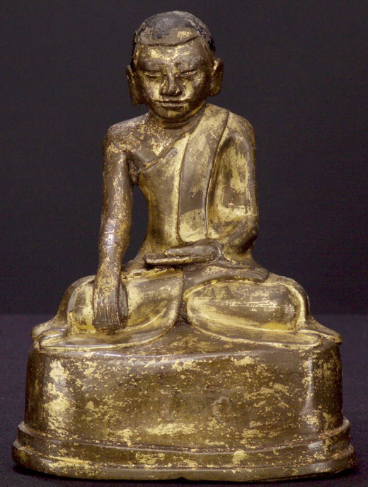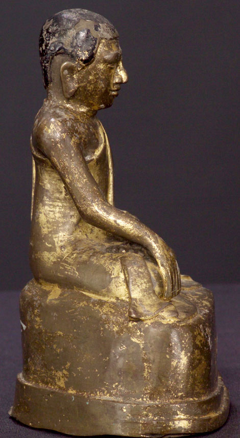 A personal favorite- a (probably) Burmese Monk portrait sculpture done in Tibetan style. Gilded, with a name or phrase lightly inscribed in the base. This is the only early bronze piece of its type I have ever come across (I’ve come across a few in lacquer or wood- none quite as nice, and none so Tibetan looking). Gilded with a high quality gilding (again more like in Tibet than in Burma. Hard to date, as I’m not familiar with this type, based on the feel, casting, patina, gilding etc, I’m estimating 18th century. I am going to put this in to the “Tibetan” section, as I believe that stylistically he belongs there even though he was probably made just south of there. Sits a bit over 6 inches tall. All original.
