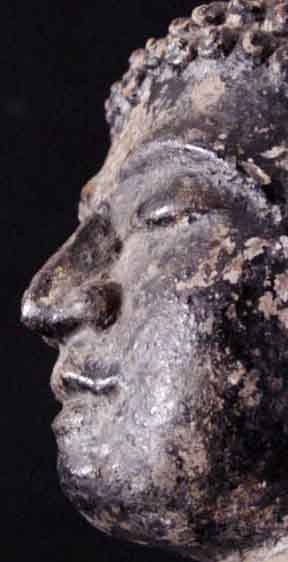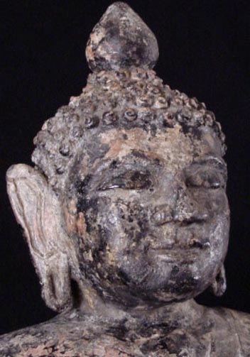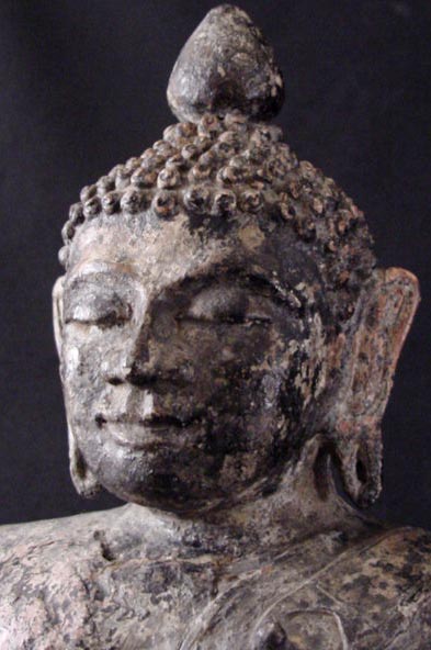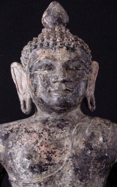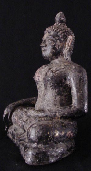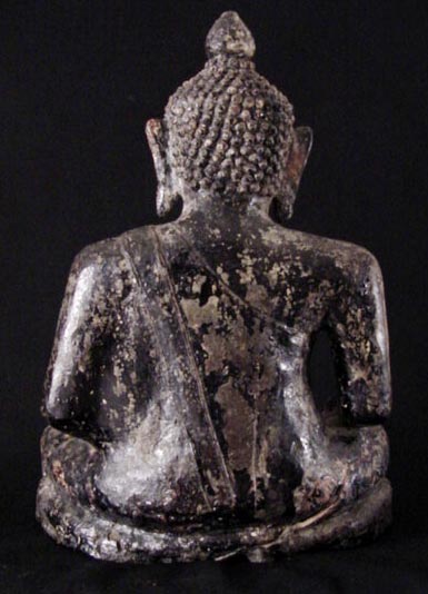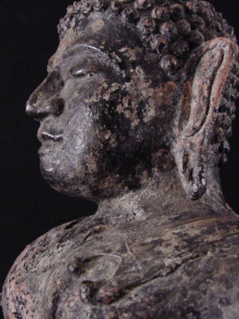 Very unusual Lead/Bronze Laos Buddha. It is a very good size at 15 and 1/2 inches high by close to 12 inches wide by 7 inches deep. It weighs over 50 pounds (with no clay core!). The dimensions don't fully convey the mass of this one, as he is so broad and deep. I put a 4 inch Buddha in one photo to give a sense of his large size. While he has a folk quality, the sculpting (and the casting) are remarkably sophisticated. The patina is outstanding, with traces of lacquer and gilding. Look at the photos: they convey the wonder of this piece far more than any words could do.