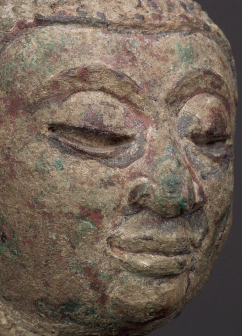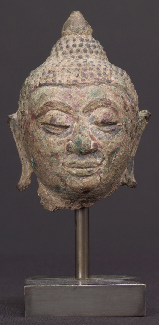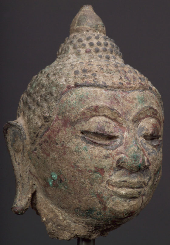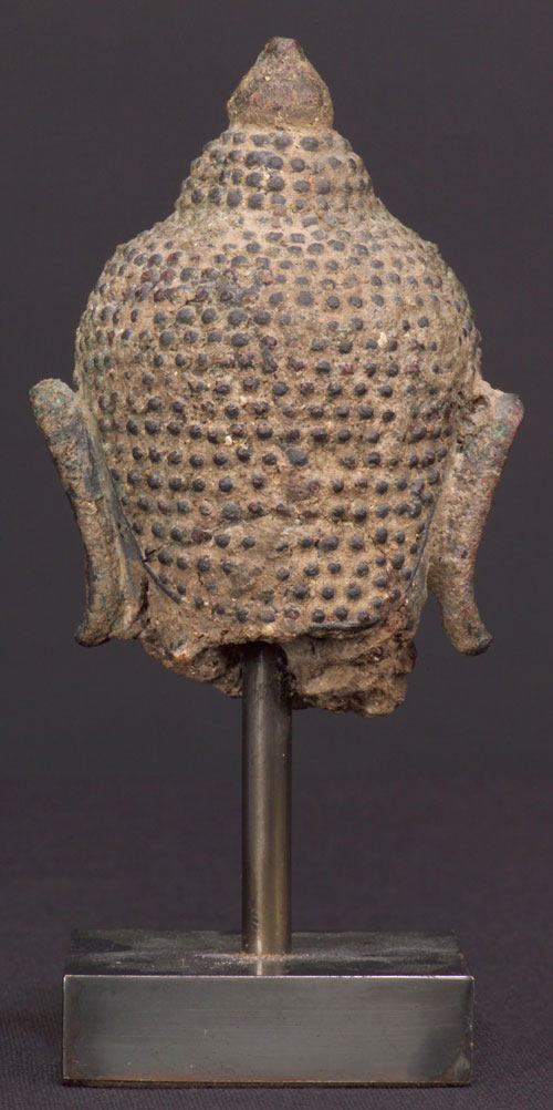 Very distinctive Thai Bronze Buddha in the “Kanom Thom” style, with his round face and unusual look. His body would have also had a much rounder look than most Thai Buddhas of the period as well. This is a regional variant found in both the far south and far north of Thailand in two particular areas during the 17th centuries. It is believed that the style derived from the emulation of one particular statue. Extremely well sculpted and nicely cast head. A decent size at 3.5" tall; 5.25" including base.