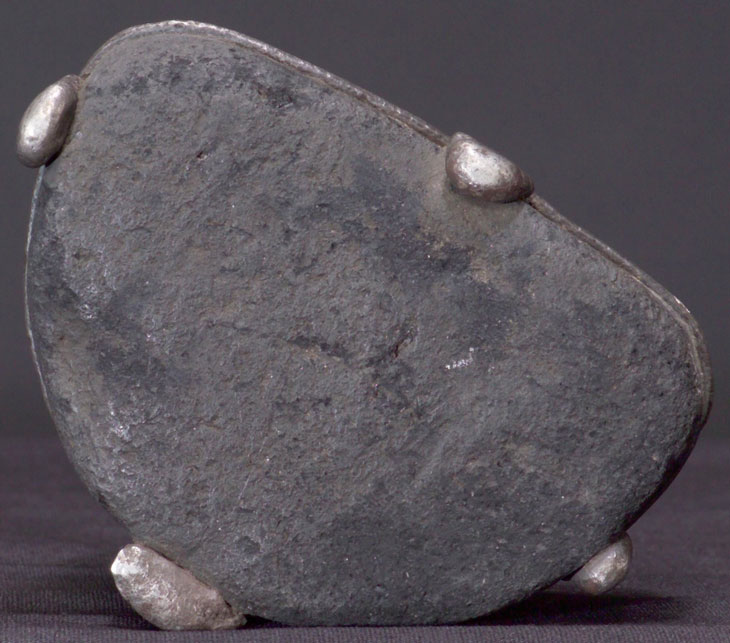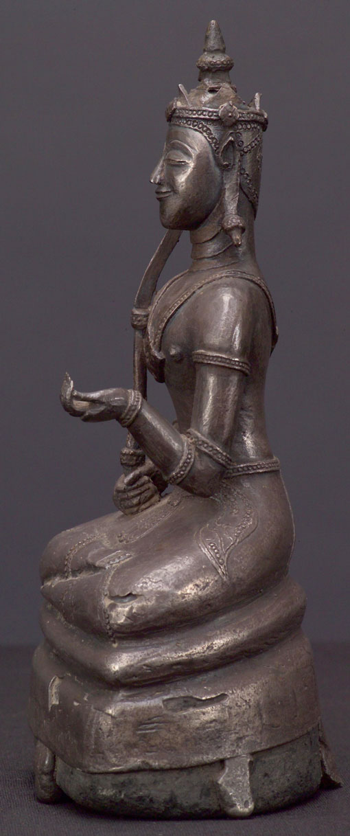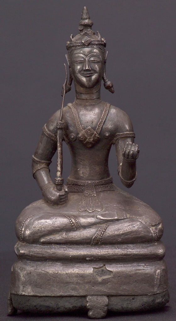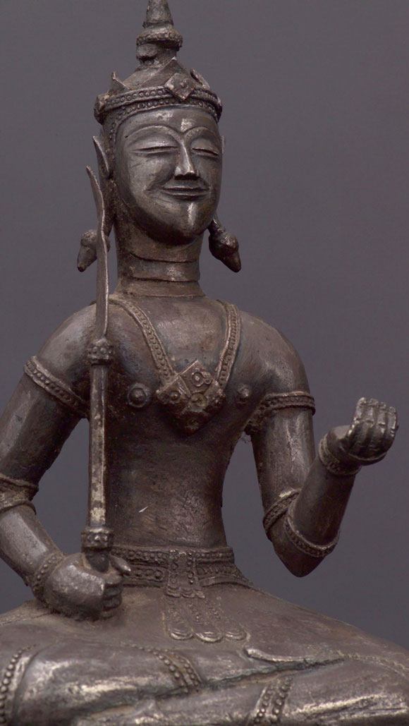 Very uncommon thickly and beautifully cast silver Thai Buddhist figure. He is holding a sword (Perhaps the Buddha in another lifetime?) He is 4 little legs and a full clay core which comes down lower than the base of the statue- this is unusual. He does lean to the right (easy to keep level with a small bit of something pushed under the lower corner). The face on this sculpture is absolutely fantastic- as good as they get. This piece may be unique. Sits 7-3/8" tall.