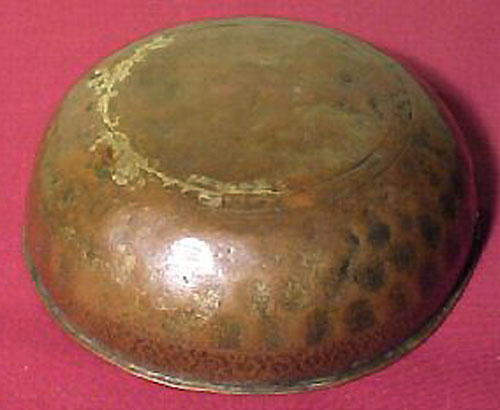 Very early eastern bronze bowl - likely over 1,000 years old. Looks to be made of copper. Wonderful engraving with 4 faces. 6.5" across, 2" high.