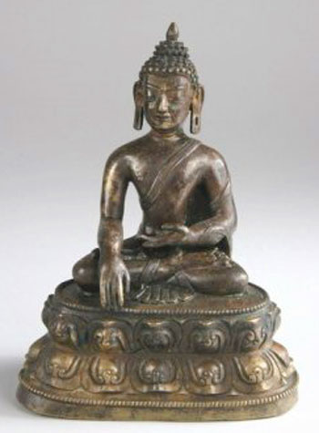 Very fine 14th-15th century Tibetan bronze Buddha. Everything about him is first rate. The sculpting, casting, and finishing are all done with great care all the way down to the fingernails. The face on this Buddha is absolutely superb, and is as good as those seen in the very high end auctions. This is a real collector’s piece. Note the special motif on the lotus petals. Stands 7.25 inches tall by 5.5 inches wide at the extra-wide base