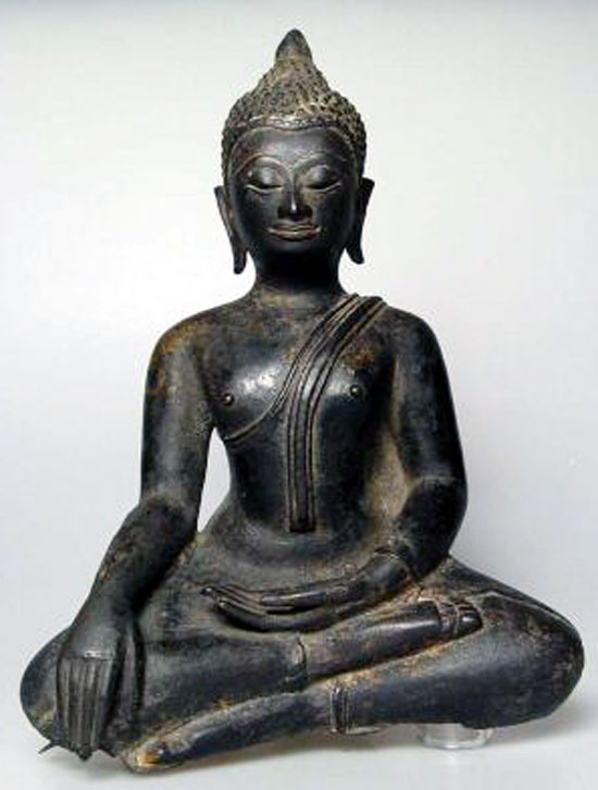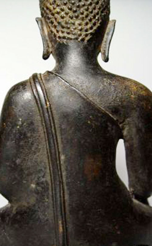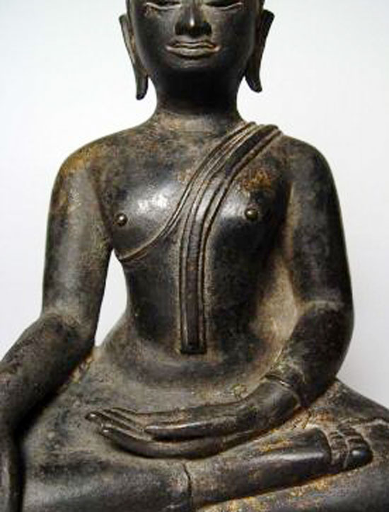 A true beauty- an extremely fine 15th century Thai Buddha- probably in Kamphen Phet style, which is a special late Sukothai style. This type is more masculine, with a broader chest and wider shoulders, as well as a stronger face than the more common Sukothai style. He is extremely finely sculpted and cast, and is close to being a masterpiece. The base is missing, and he leas very slightly to one side. This is not uncommon on very early Thai bronze Buddhas from the Northern and central parts of Thailand. There were periods when bronze was scarce, and fine bronze bases were removed and re-used. The integrity of the body was important, but not the base. It affects the value of such a great Buddha little. He sits 8.75 inches tall by 6.25 inches wide at the knees. Would have been a good 12 inches with his base