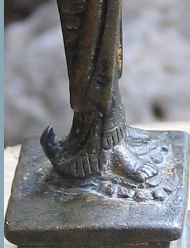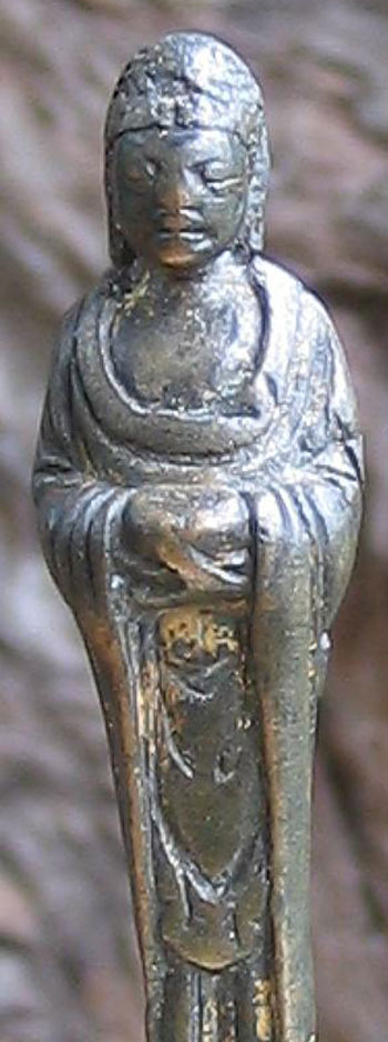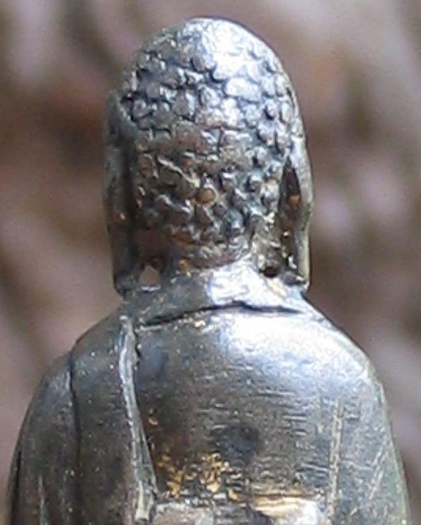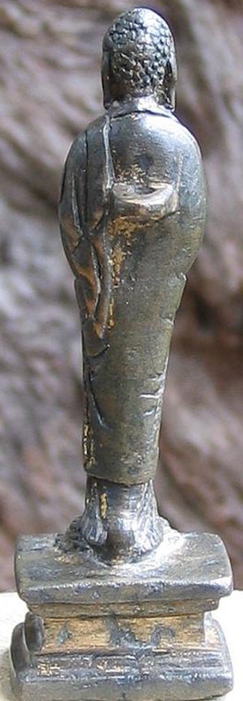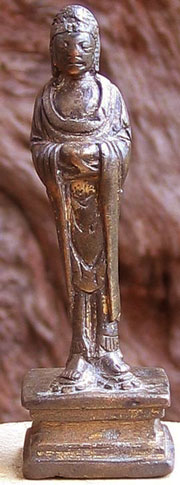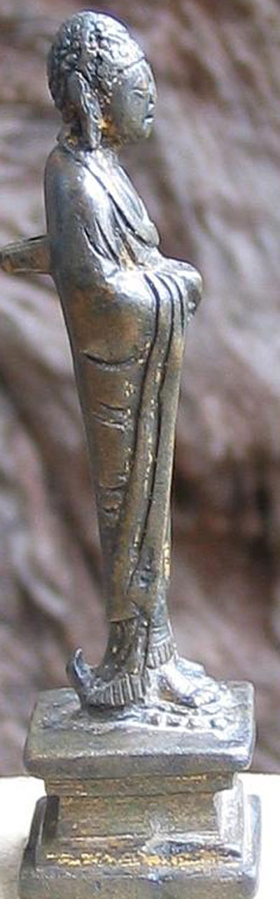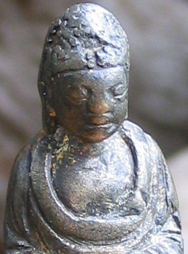 Perfect - study the photos before you look at the size. This fellow is a classic form of a Liao bronze Buddha- with each foot stepping on a lotus petal, his long graceful body flows up to his beautific face. He is a full 1,000 years old. He has wear, but just the right amount to make him even more beautiful. Remains of gilding. He is not inexpensive, but you won’t find another like him- his size- 3 and 3/16th inches tall.
