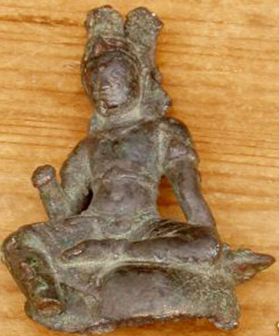 This is a very early bronze Bodhisattva from the island of Java. It was collected in Java in the 1960’s by the renowned auction house of Spink, which is based in London. I purchased it many years ago from an English collector who was selling off a significant part of an important collection. While the piece has losses as can be seen in the photos, it still has a grace and finesse not typically encountered in such early bronzes from this area. It is solid cast and comes on a custom-made stand. The actual bronze is 4 inches tall; sitting on the stand it is closer to 5 inches tall.