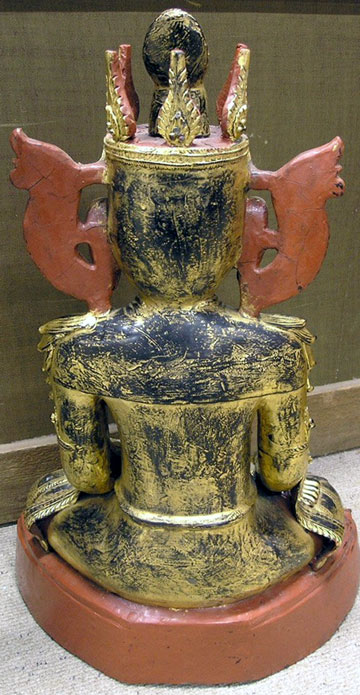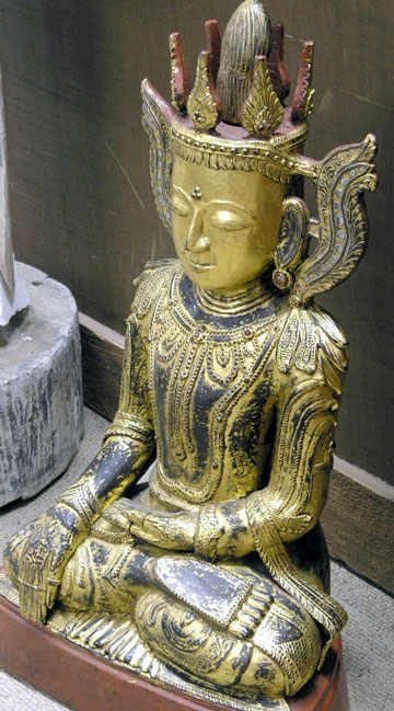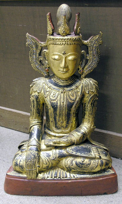 This is a spectacular old Burmese lacquer Buddha from the Arakan region. He sits 30 inches tall by 20 inches wide by 11 inches deep. He came to the US close to 50 years ago with an Ex-diplomat who had been working in SE Asia, and had remained in storage for most of that time (this is in part what accounts for his outstanding condition). He was not new when purchased, and probably approaches 100 years old. Has a bit of the usual cracks and other minor cosmetic dings, but overall is in super shape, with no losses or repairs. He is very large for regular mail, but can probably go oversize FEDEX ground. If he needs to be crated, shipping will be much higher. Please check for shipping specifics. Wonderful!!