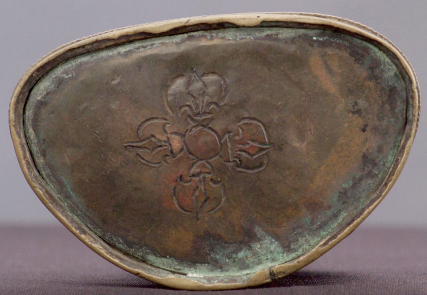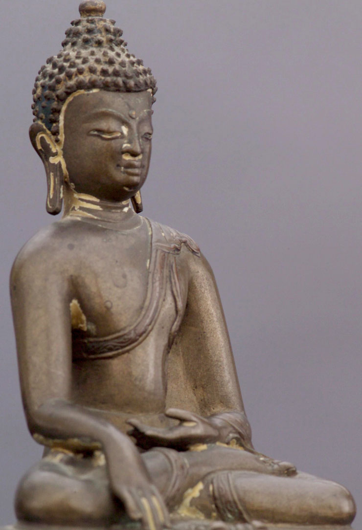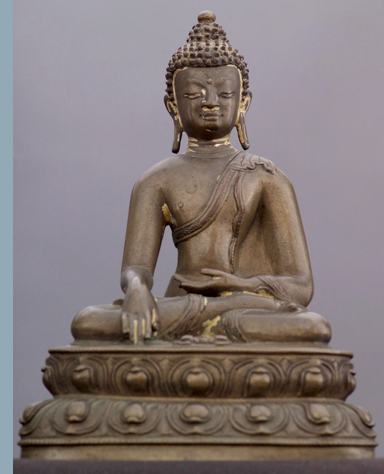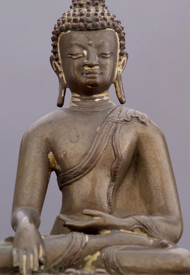 Fine Tibetan bronze or copper/bronze Buddha. This is a particularly fine example of its type. Note the high quality of the sculpting and casting. Still has traces of original polychrome, which is remarkable given that it is in the range of 500+ years old. Original seal looks to be intact. 5.5" tall.