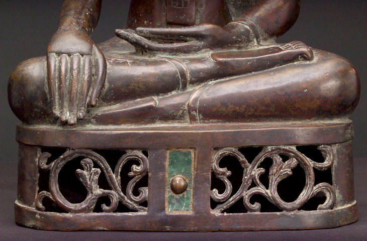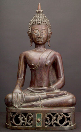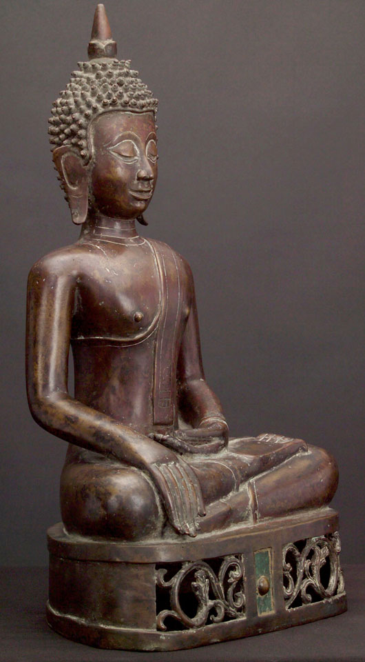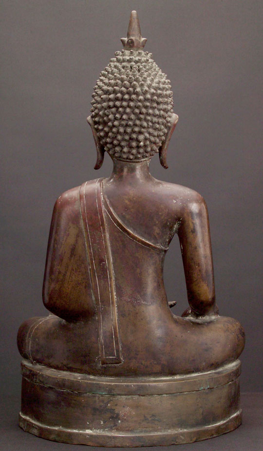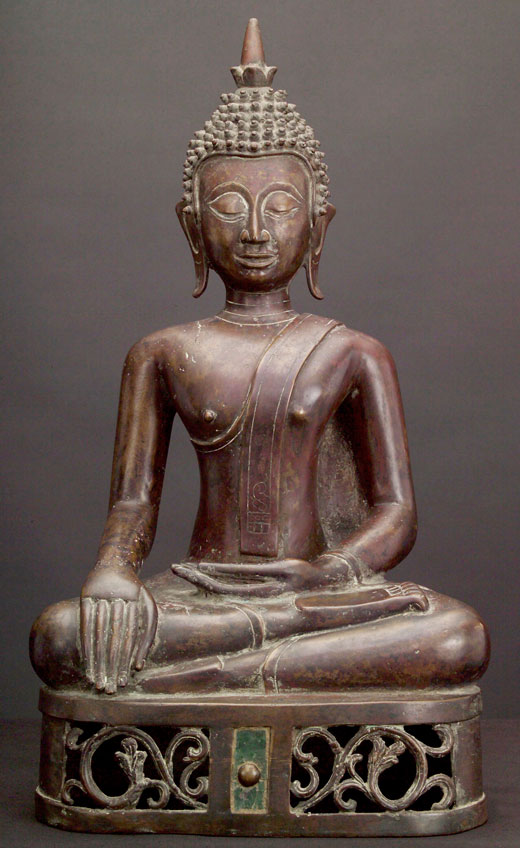 This is a very special Buddha, and a personal favorite. It is a large, very finely sculpted and cast Thai bronze Buddha, from the area of Nan, (now a modern city and province, it was a small kindom in northeast Thailand until modern times). It's Buddhas have influences from Northern Thai (Lanna) style as well as from Laos Buddhas. It has good age to it, and I am estimating 18/19th century. It is an extremely large example at over 20.5 inches tall by a full 11 inches wide at the knees. The patina is superb- as good as they get. It does not appear to have ever been gilded. It has a very special open work base, with a unique button" which has been rubbed through the ages for good luck. The button has a small amount of glass inlay surrounding it which looks to be original. Condition is near perfect. Simply put- I have not seen one better."