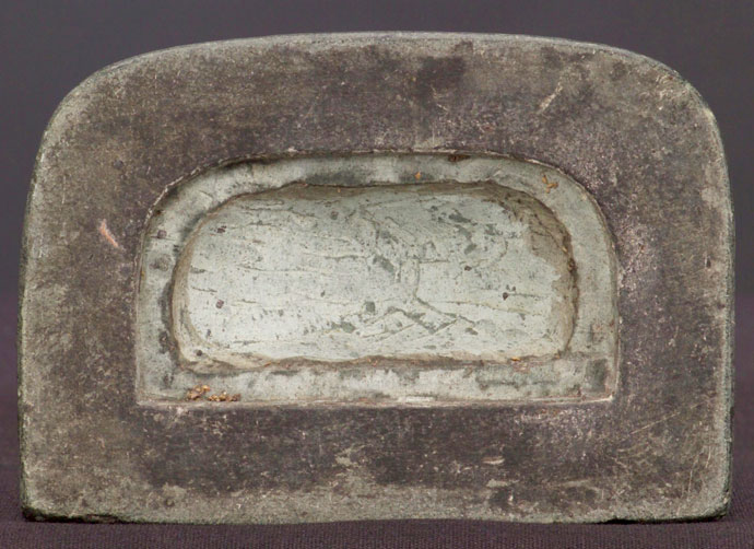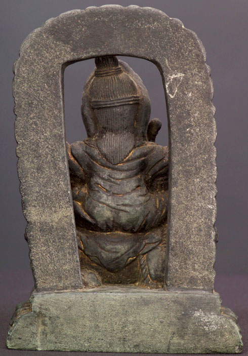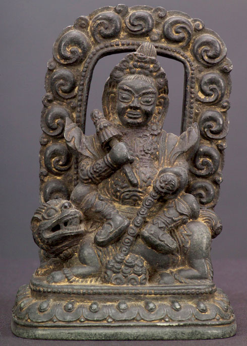 Highly unusual Tibetan stone sculpture of a protective deity. Looks to have good age. Came to me from an excellent source as 18thC, but I do not know how to date a piece like this reliably. extremely well carved. 6.5" tall. I have the wood piece to cover the bottom, and it will be in place when shipped to the new owner. It is not in place in the photo showing the bottom of the item.