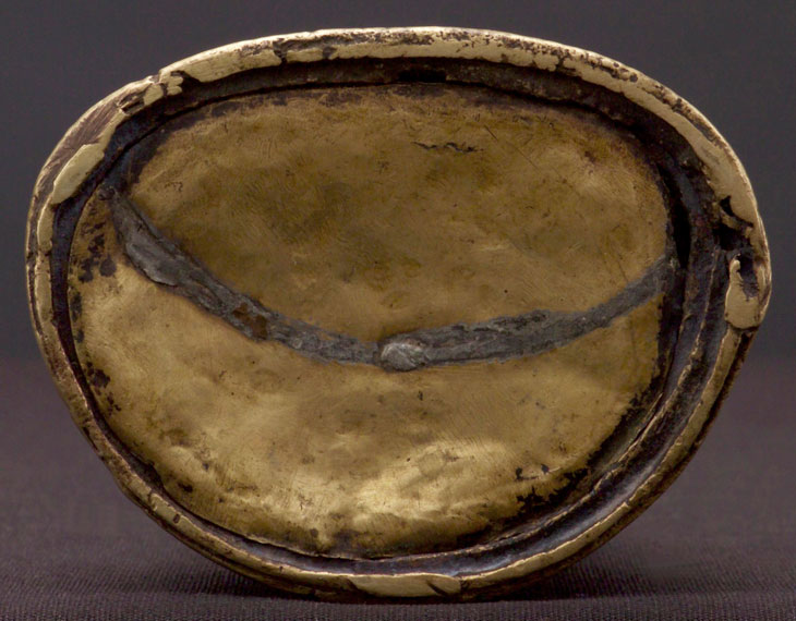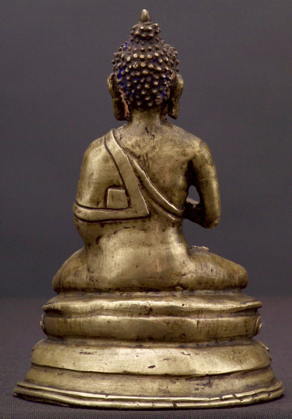 This is a powerfully serene and very deeply concentrating 15/16thC Tibetan bronze or copper alloy Buddha. He has wear from 400 to 600 years of devotion, but is quite complete, and is still sealed. He does not have a copper plate on the bottom, but has a leather or thick cloth seal which looks like it has never been broken. There are minor traces of blue pigment in his hair. I don't believe he was ever gilded. An uncommon type. He sits close to 5 inches tall