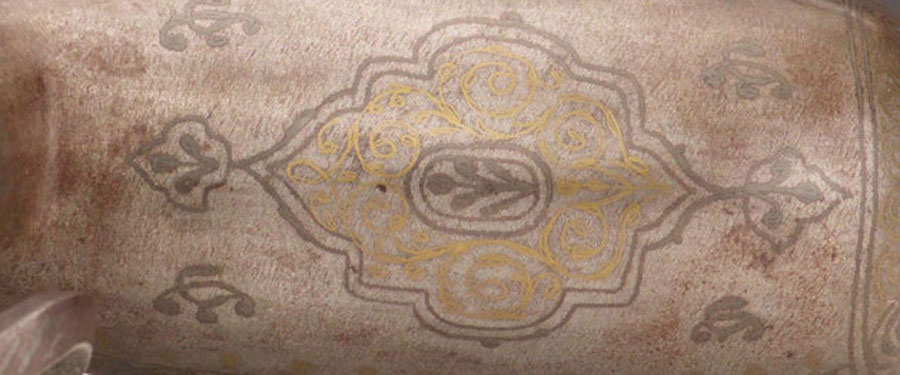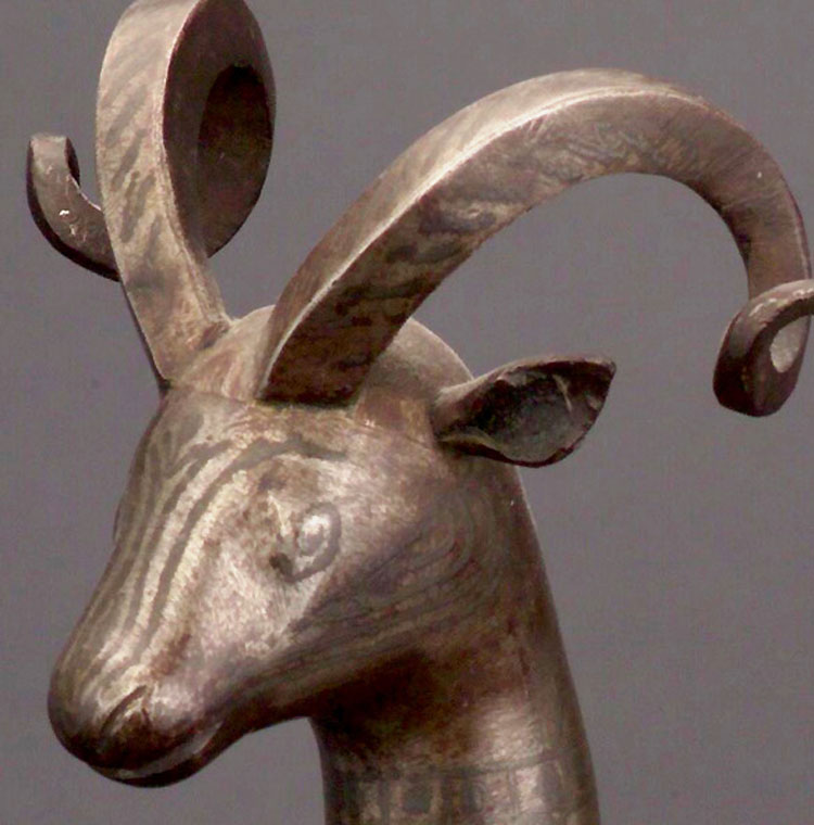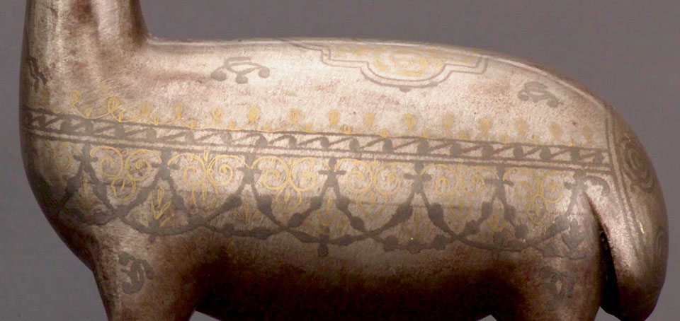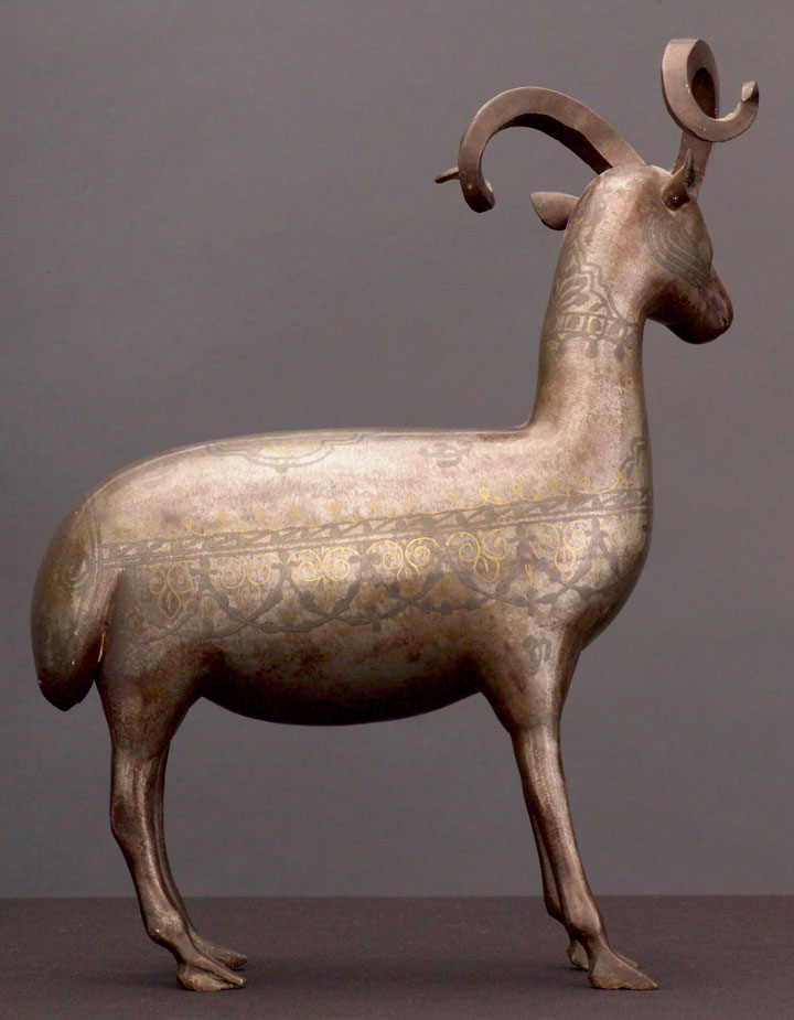 Silver and gold inlaid steel. 10" tall. I found a very close example from the same workshop- It is a very rare and fine type of object- the primary difference betwwen mine and the other is that the inlay is slightly different. They are asking 4,000 for theirs. I'm asking roughly half the price for mine. The inlay is almost pure gold, silver, and probably copper, of the highest quality.