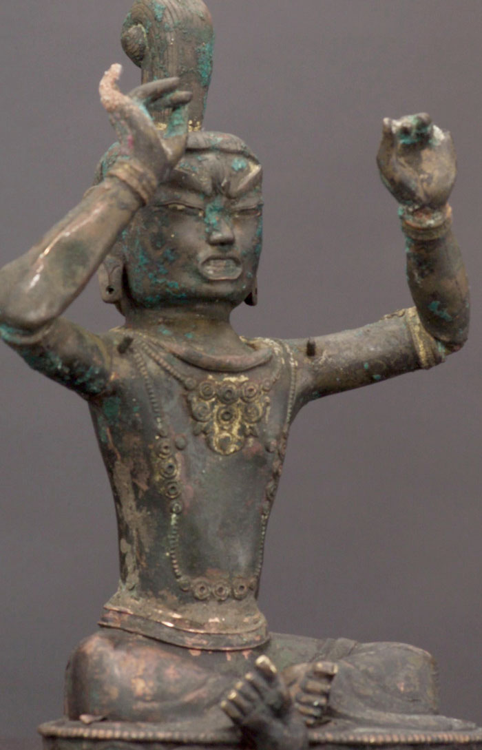 Mongolian fierce emanation of Shiva. Excavated from the site of a temple which was destroyed by the Russians when they marched through Mongolia in the 1920's. Extremely rare- perhaps unique. No one I’ve shown it to has ever seen one like it. Incredible expressiveness and animation- you can see clearly how finely sculpted this piece is down to the small details. Copper. 9.5" tall. Condition issues and losses as seen in the photos.