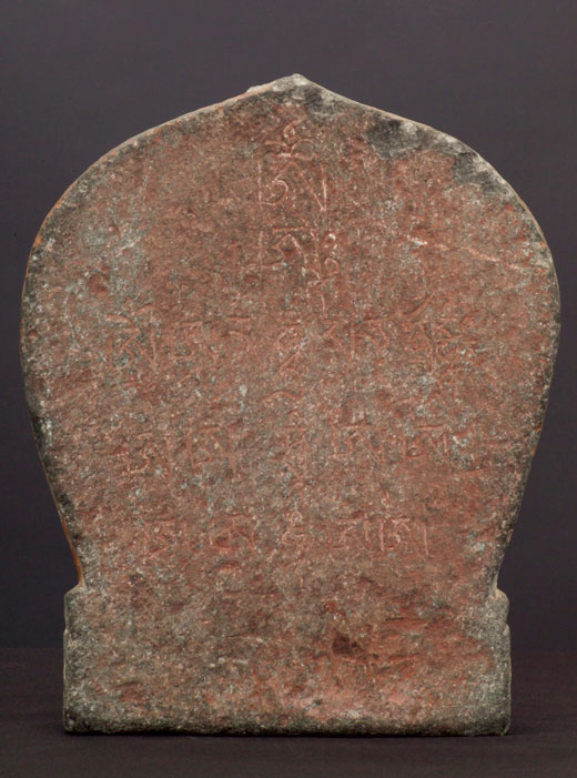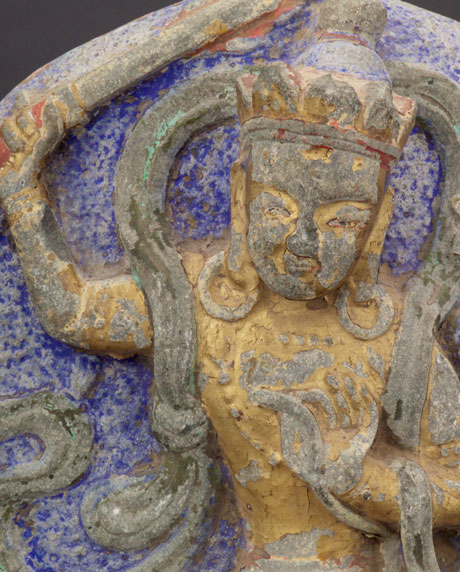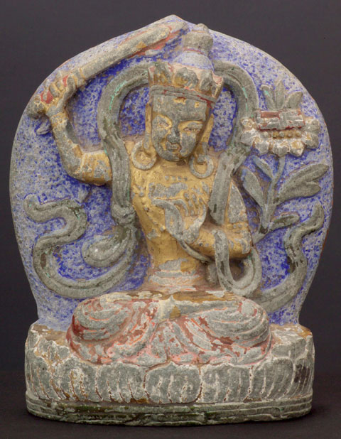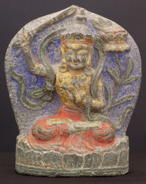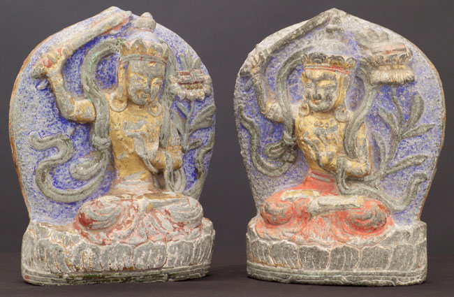 Large pair of inner Mongolia (now part of China) polychrome Buddhist stone images of Manjushri- who cuts through ignorance with his sword. Extensive inscriptions on the back of each. One of these in this condition would be rare- a pair is extremely rare.