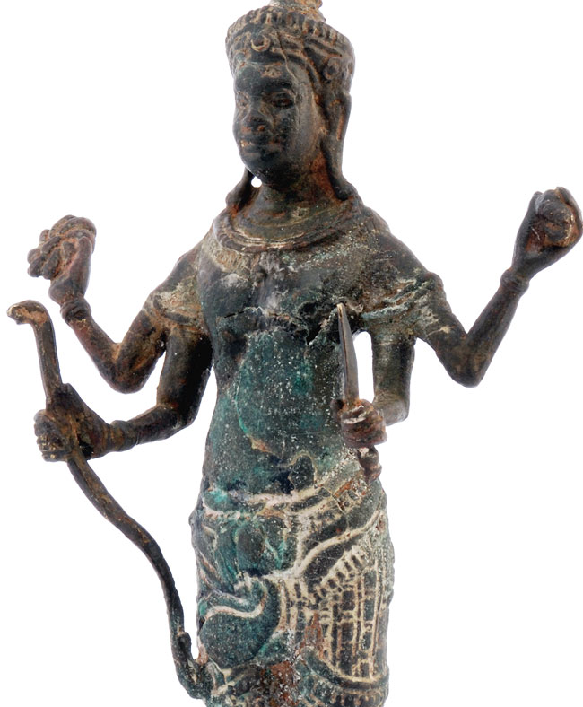 Vishnu. This piece is from a period after the classic Angkor Wat period and before modern times. Based on other related pieces I've seen and people I've shown it to, it is probably in the range of 13th to 15th century. 7.25" tall.