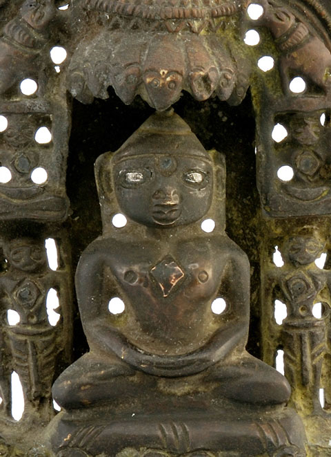 Jain figure. 18th-19th Century or earlier. 8" tall. I purchased this from an estate - at the time I did not know that it had silver and copper inlay, as the entire piece was nearly black. The eyes can now see - there is still more to be brought out of this piece with a cleaning (or not - I leave this to buyer's discretion).Authentic pieces of this type are now few and far between. Wonderfully expressive, with loads of writing on the back and bottom