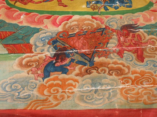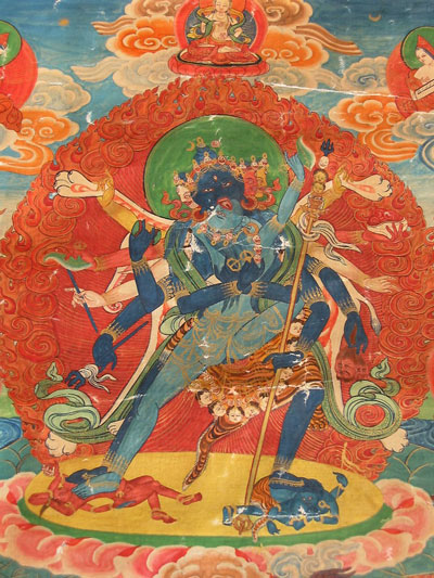 12" wide x 15" tall. Beautiful Tibetan thanka. A bit of a mystery - looks to have good age, although it does not have the usual smoky smell. Came as part of a collection, it appears that a number of them may have been washed. Not a typical modern repro - much better quality.
