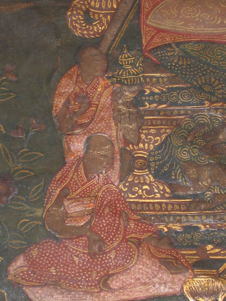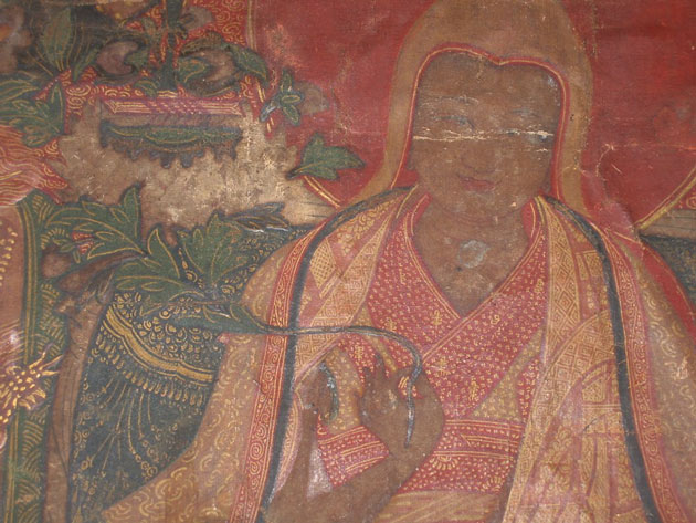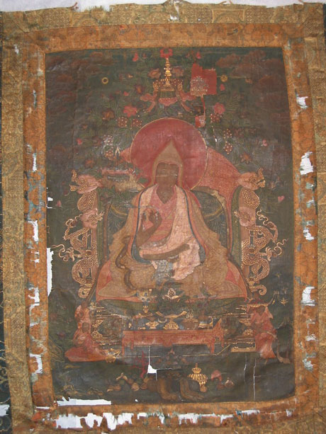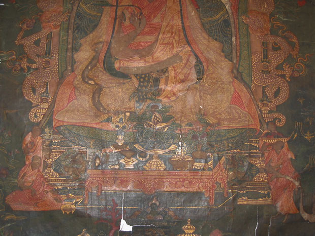12" wide x 18" tall. Beautiful Tibetan thanka. It is the oldest of a group of thankas I recently purchased. Appears to be 18th century or earlier. Has significant condition problems due to so many generations of ritual use.