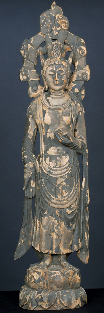 Large wooden figure of Kannon. Probably late Meiji. Remains of original lacquer as seen in photo. Quite large at 35.5" tall.