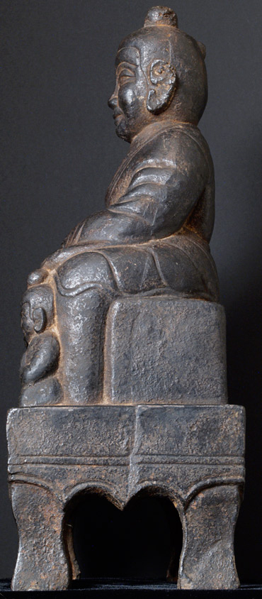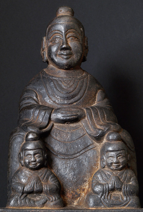 Very special IRON Bodhisattva with 2 attendants. My guess is 17/18thC- might be earlier. The faces are especially kind and sweet. Everyone who sees this piece smiles. Large at 10.5 inches tall. Extensive inscription on the reverse. Special.