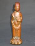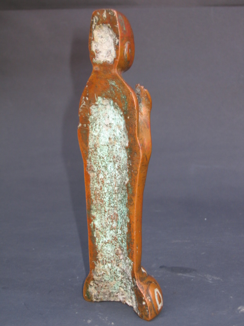 Extremely rare and early Korean Buddhist figure. Cast in a distinctive alloy which produces a deep red patina- I have seen 2 Korean Buddhas dated to the 7-9th century which were cast from this same alloy. Thickly cast, it stand on its own even though it is cast with the open flat back. There is a casting flaw at the neck, but it is superficial, and does not affect the integrity of the piece. A good size at 7 inches tall. The fan in his hands was mashed a bit as can be seen in the photos- othewise in superb condition. One of a kind.