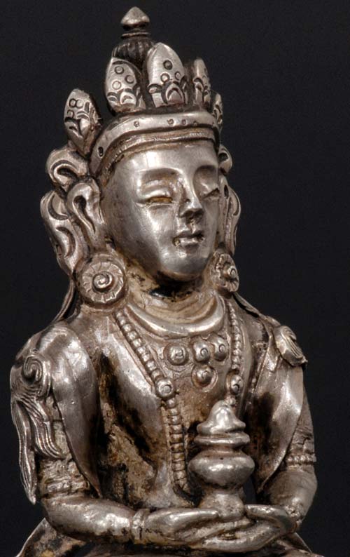 Beautiful silver Bodhisattva- Amateyus, who embodies long life. Possibly Mongolian. The base has the original silver seal. Never seen another quite like this one. 2 and 7/8 inches tall.