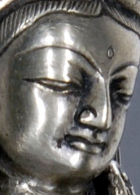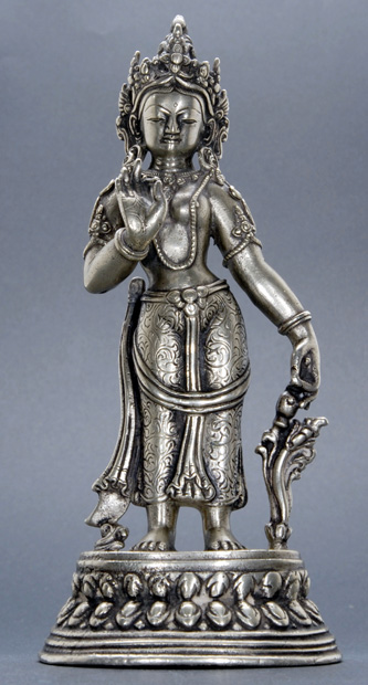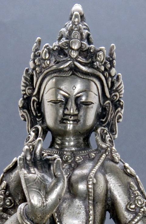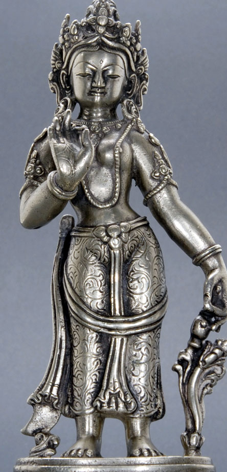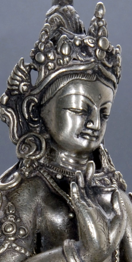 Beautiful antique Nepalese Bodhisattva. Cast out of either a silver colored bronze or a silver alloy. Stands 6.75 inches tall. The base appears to be sealed and consecrated.