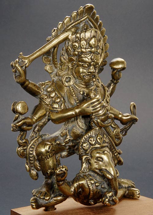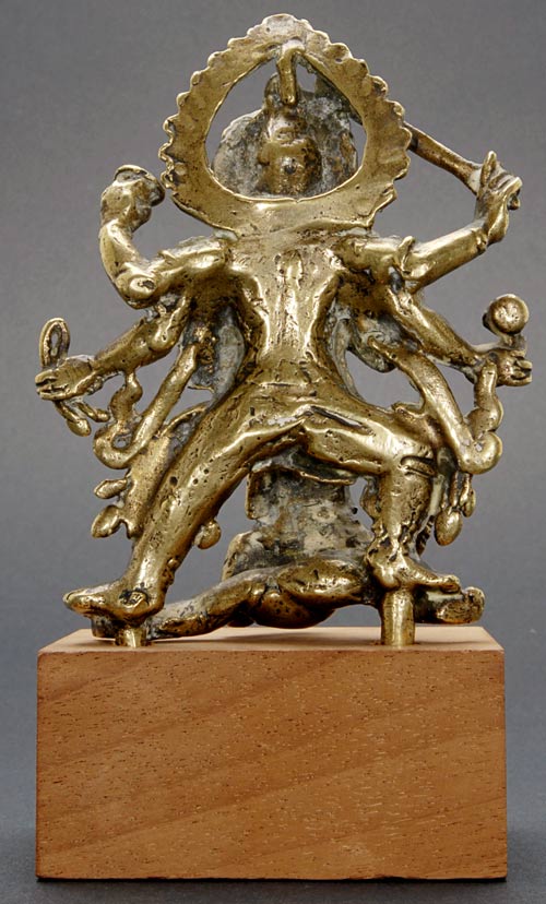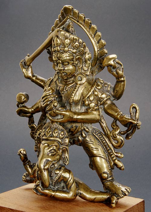 Wonderful 17/18thC Nepal fierce deity in lively attitude standing on Ganesh. Solid cast. Quite uncommon. Stands 4.75 inches tall, closer to 7 inches including the base.
