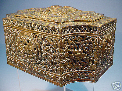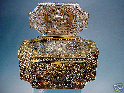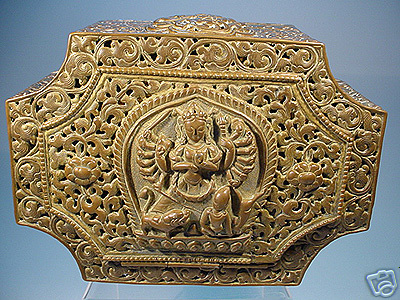 Very uncommon 18/19thC Nepalese or Tibetan pierced repousse box- probably for temple use. Significant wear from ritual use. The nose of the deity on top is worn though. Very finly done. I've never seen another like it- all of the related pieces I've seen have either been early 20th century or modern emulations- this is the real thing. 7 inches wide by 5 inches deep by 3 inches high.