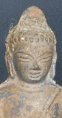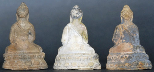 Set of 3 very small Buddhas- very rare to find 3 related pieces which have staid together so long. Each sits 1 and 1/8 inches tall