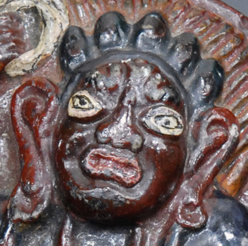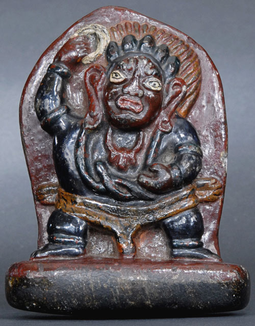 Extremely uncommon 14/15thC Tibetan protective deity carved out of a hard black stone. Quite animated.4 inches tall.