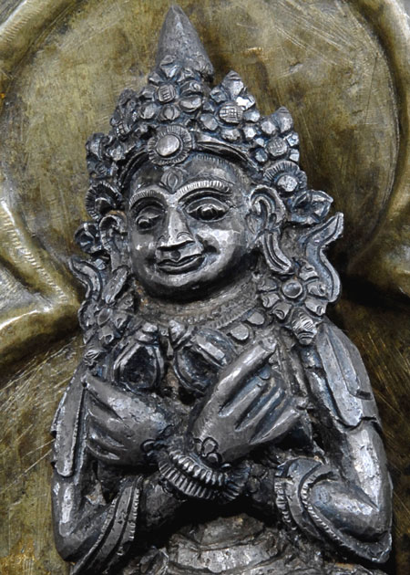 A long time personal favorite- 3 different metals (backplate, base and Bodhisattva- Vadrasattva), and one of the best and most distinctive faces I have seen on any Himalayan piece. There is a bit of writing on the base. Quite old- I have no idea how to date this one.4.5 inches to the top of the back plate.