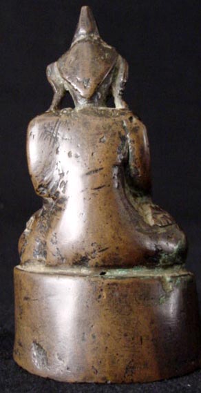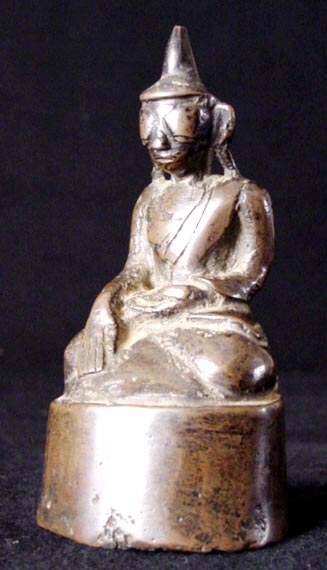This is an extremely provincial Buddha with a wonderful feel. It looks to be a very early Shan style Buddha with a Mon influence. It is thickly cast and has a fabulous expression with huge downcast eyes. Stands 4 and 1/2 inches high.