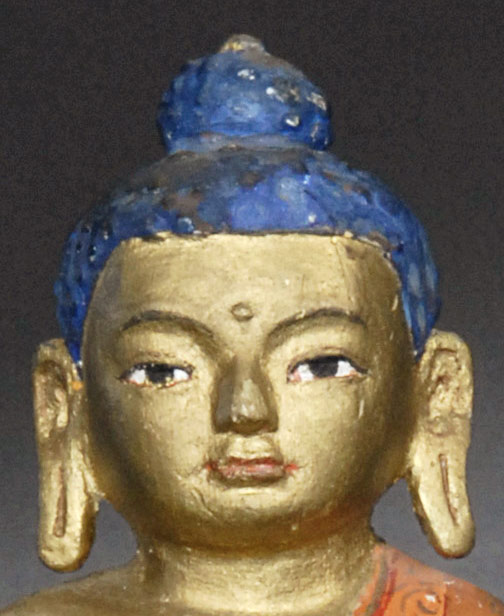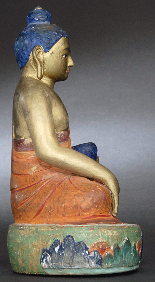 Fantastic Mongolian Buddha sculpted out of wood and then polychromed. Remarkable condition- almost certeinly has spent its life in a Gau box. 6 inches tall.