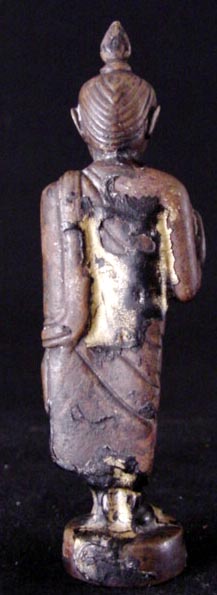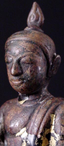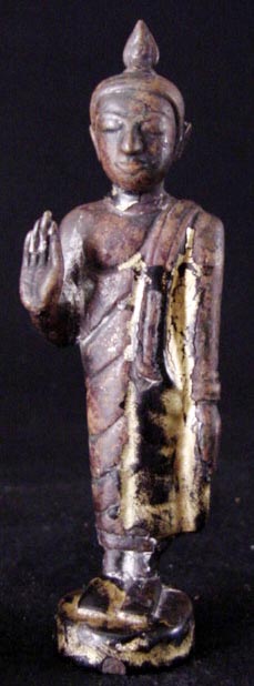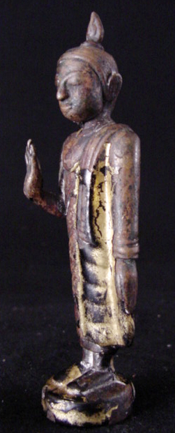 This one is a "Lanka" style Buddha from Burma from 14/15thC. It was thickly covered with many layers of lacquer and gilding, which completely hid the underlying figure. I did something I almost never do: I chipped away the layers to find this wonderful figure underneath. It is solid cast It stands 4 and 7/8 inches high.