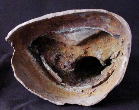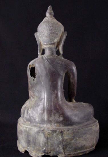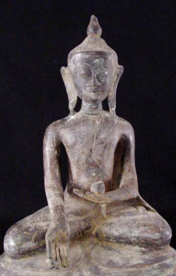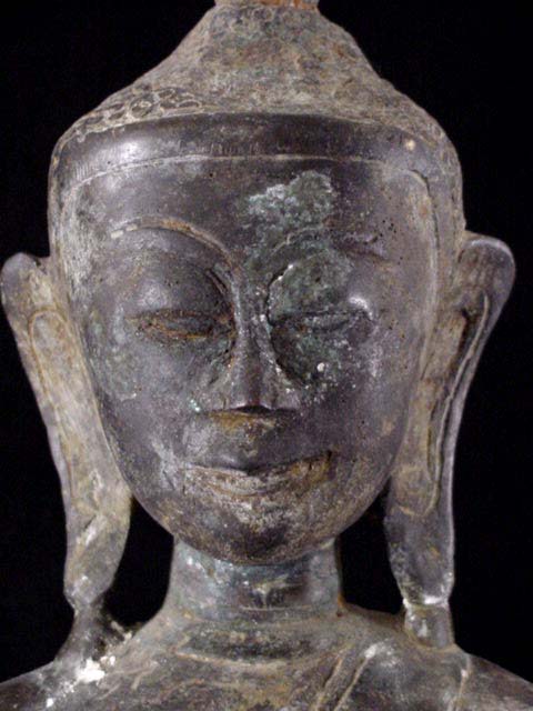 This is an a wonderful and rarely encountered large Burmese Buddha. The face and long ears look related to Shan style Buddhas, but it may be earlier: the mudra, the construction and casting, the flattened head and the bronze alloy appear pre-Shan. I have seen a number of small Buddhas of this type, but never one close to this size. I have gotten one opinion that this piece is 17th century Tai Yai Shan, so I will give it an age estimate that includes this possibility. It is over 20 inches high by over 12 inches wide. It is in very good condition for it's age. It has the tip of the finial and a bit of the base missing, but the actual Buddha is complete with the exception of some original casting flaws (mostly on the back of one shoulder).