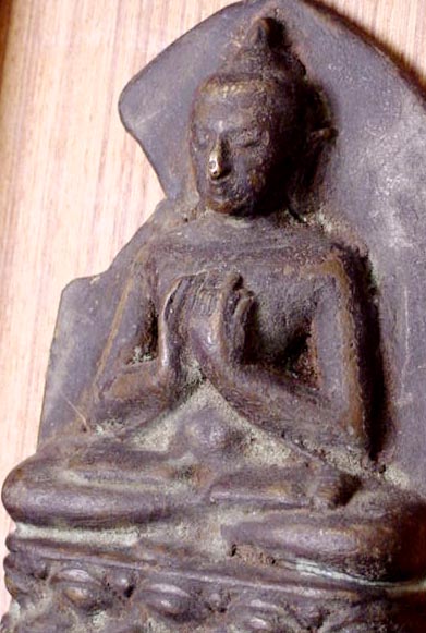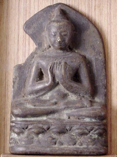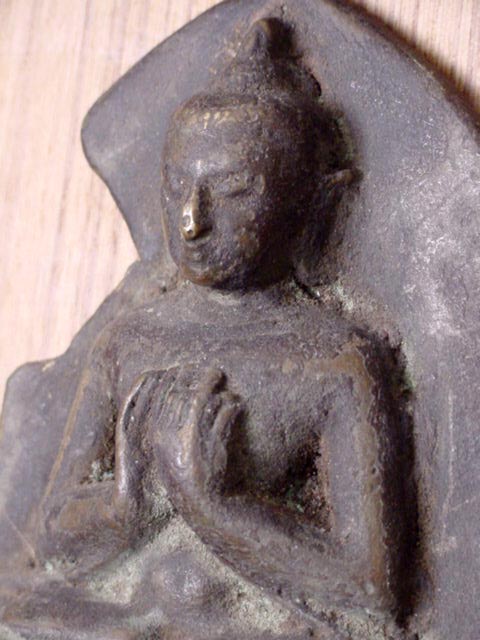 This is an uncommon and authentic 11-13thC bronze Pagan Buddha plaque. It is heavily cast of bronze, and may have originally been set in a larger Buddhist bronze panel depicting scenes from the Buddha's life . The actual bronze piece is 5 inches tall, and weighs a remarkable 22 ounces. As you can see. a piece of the back plate is missing. Buddha is in complete and uncleaned condition. The custom teak display stand is included.