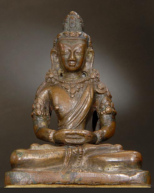 Excellent 18/19thC copper.Nepalese Amateyus, Bodhisattva of Long Life. Traces of cold gilt on the face, and blue polychrome on the hair. The arms and the ribbon of the ribbon are separately cast. This is a fine example of Newari casting – the face has the depth and equanimity of great spiritual art. Sits 3 and ¾ inches tall.