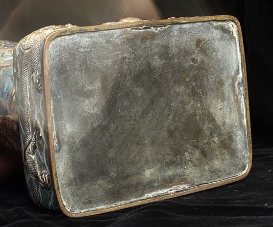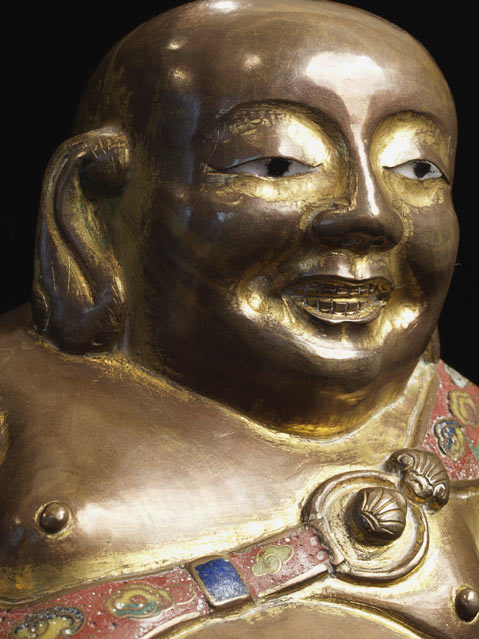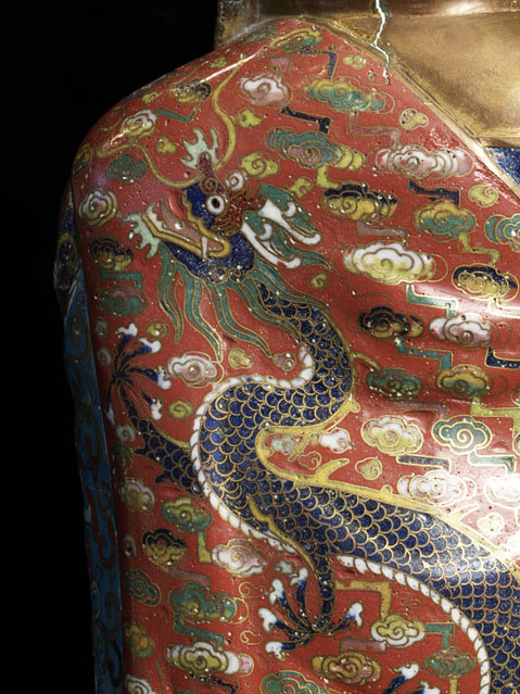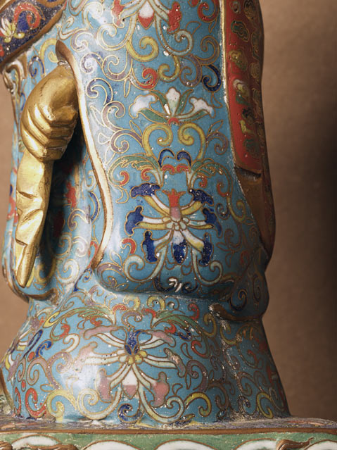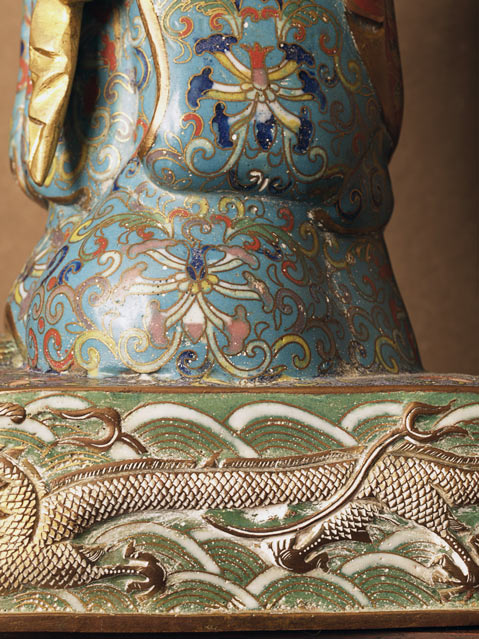 Cloisonne Buddha- remains of original gilding. The cloisonne is beautifully done, with great detail. Man fakes like this- this is an old one. 11 inches tall.