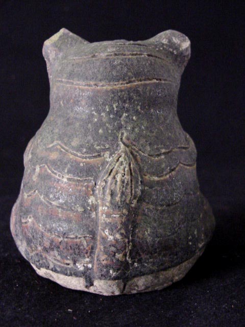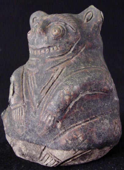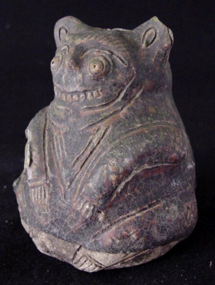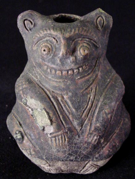 This is an amusing and delightful figural creature form (bear?) vase. It was found with a number of other animal form pieces of early pottery. It is believed that they are Cambodian based on the styling and glaze, although they were unearthed in Thailand. The glaze is degraded and there is wear and minor chipping , It is in 4 inches in height and over 3 inches wide.