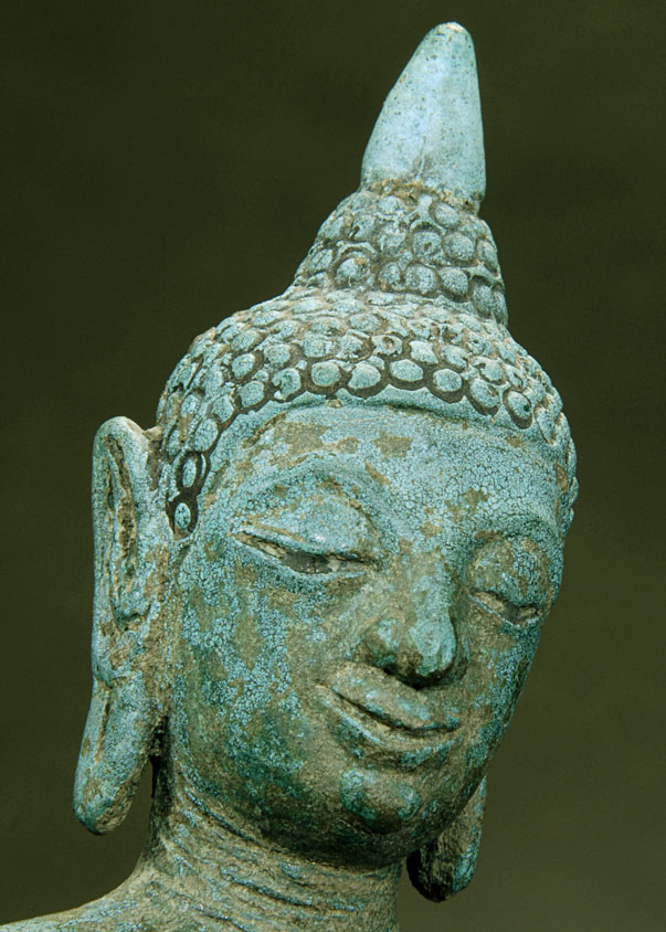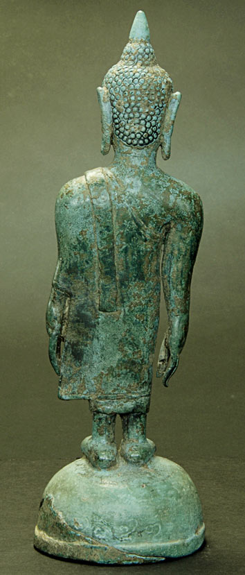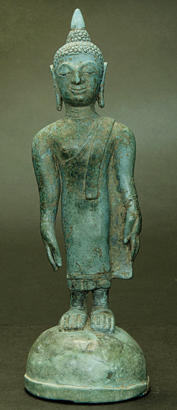 Very distinctive and uncommon Northern Thai standing Buddha. He is well cast, and is sculpted in a wonderful folk type, with large hands and feet. The bronze is a very distinctive blue-green- I've seen this patina only a few times in over 20 years of collecting- I'm not sure which component of the alloy causes this to occur. He is solid-cast, and is very heavy for his size. There are remains of the original black lacquer. There is a word written in early Thai on the base. A special piece!