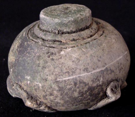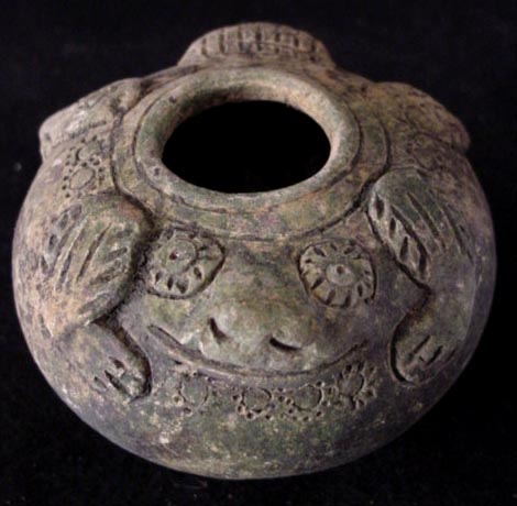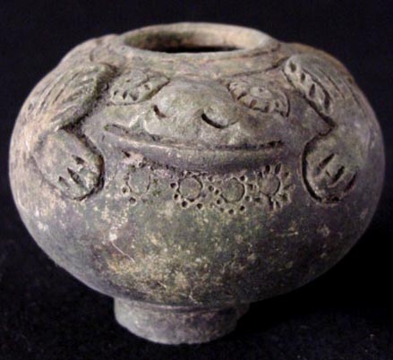 This is an amusing and delightful figural frog form vase. It was found with a number of other animal form pieces of early pottery. It is believed that they are Cambodian based on the styling and glaze, although they were unearthed in Thailand. The glaze is degraded and there is wear and scratching, It is in complete and unrepaired condition. This is a very unusual item.. It is 3 and 1/4 inches wide at it's widest