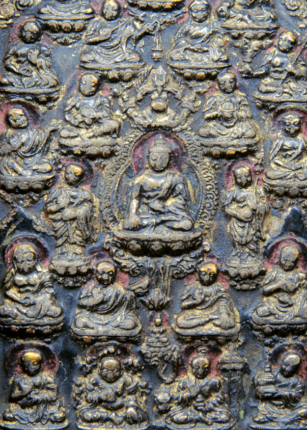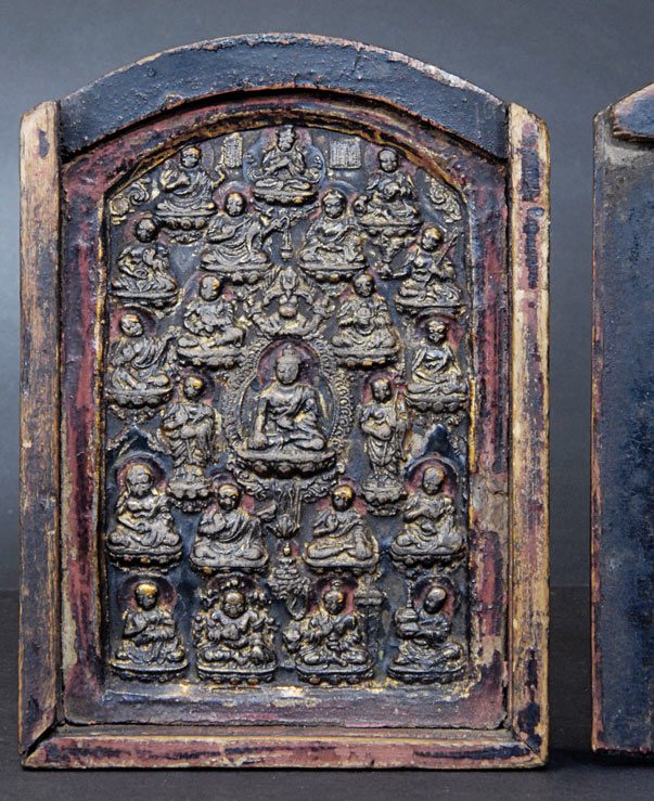 SHRINE BOX 18th - 19th Century Mongolia Wood & Clay, 5-1/4 Inches Tall Extremely fine example sculpted out of a special clay fused to wood which allows for great detail. There is a central Buddha flanked by 2 attendants plus 19 other deities. The piece comes with the original sliding front plate- these usually go missing. Special!