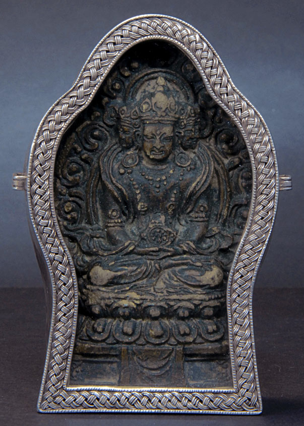 Exquisite all silver Gau box with finely detailed intertwining designwork on the front. The figure is Amateyus, Bodhisattva of long life. It is an especially beautiful and well crafted figure. I believe that this one is quite a bit older than most of my other pieces of this type. One of the most beautiful Mongolian Gau boxes I have ever seen