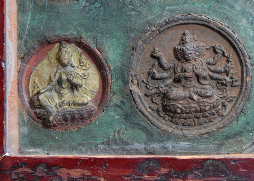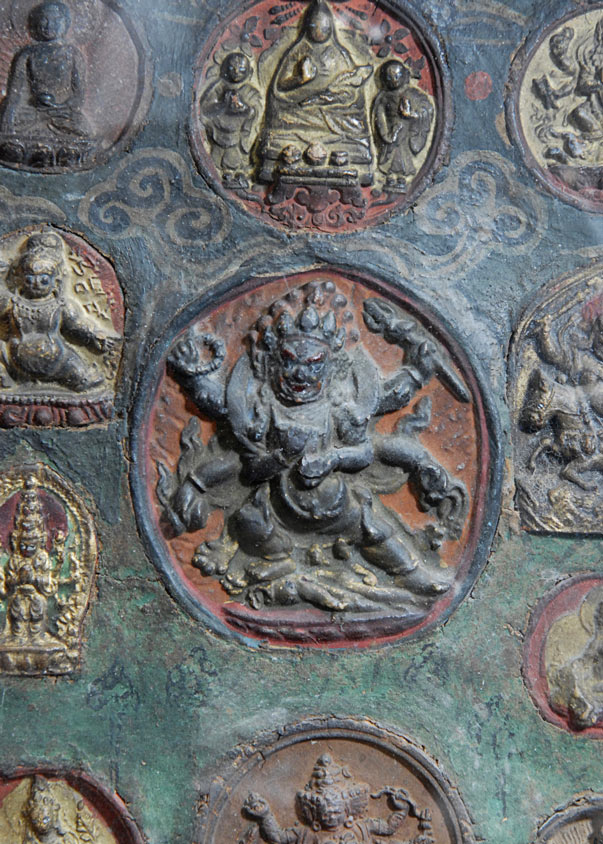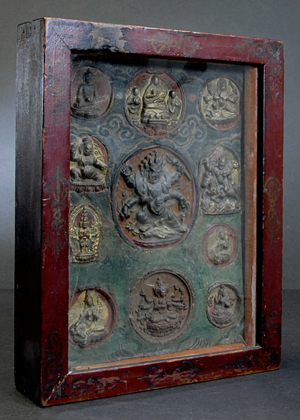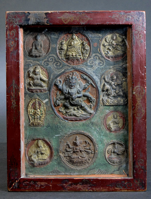 This piece has 11 small tsa tsas set in to alager green clay background. Never seen another like it.