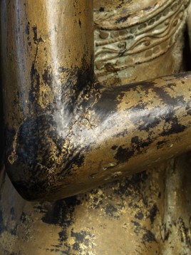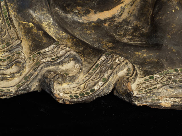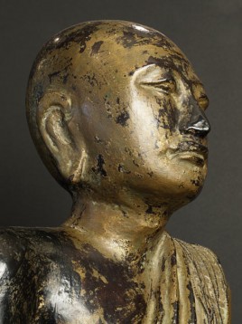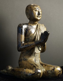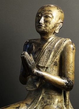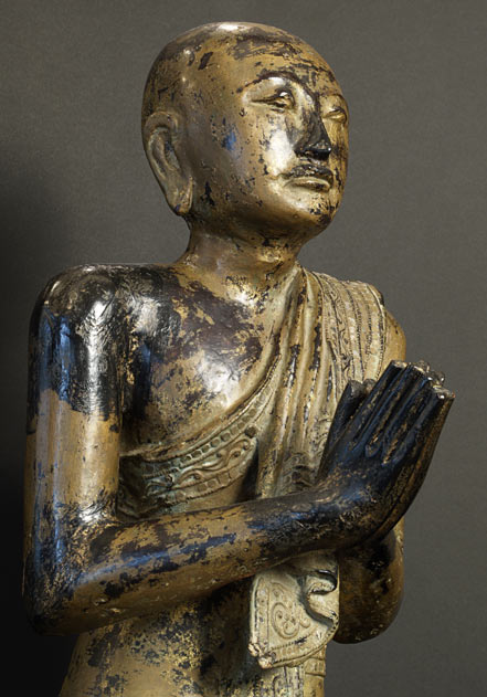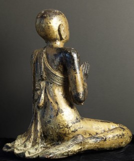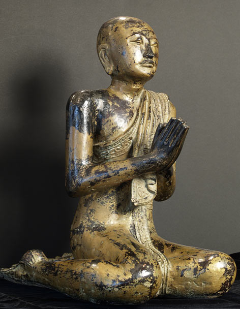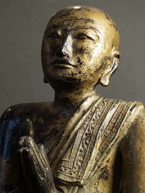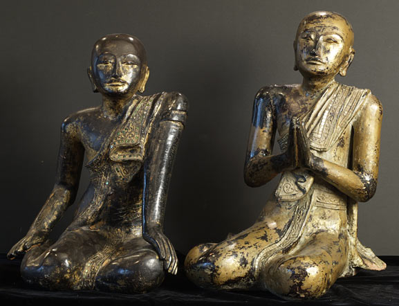 Near pair of solid wood Burmese Mandalay style Monks. Very good size- would have been at the feet of a larger Buddha on a temple altar. Original lacquer, gilding, and mirrored glass remain. Fine examples- very hard to find of this quality, size, and condition.