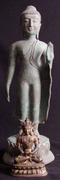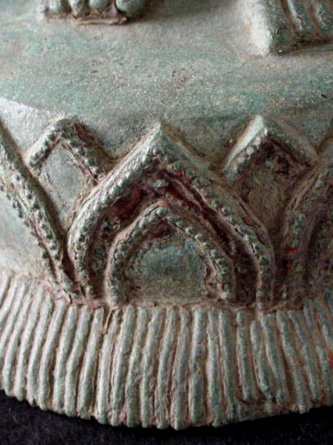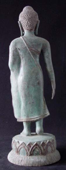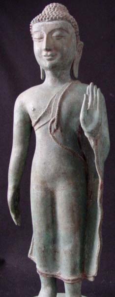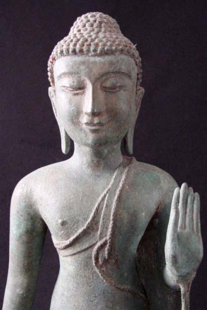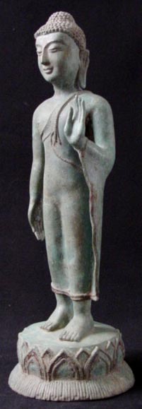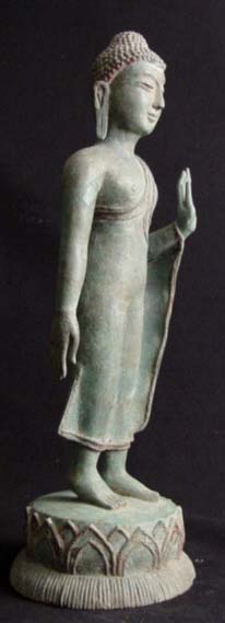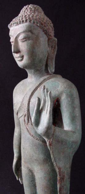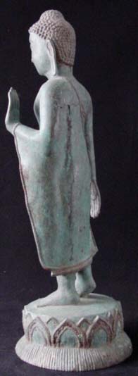 This one is a mystery: at first I thought it was early Mandalay (18/early 19thC) Burmese emulation of a walking Sukothai Buddha. I based this on the shape of the top of the head and the shape of the face. I have shown it to a knowledgable collector who believes that it is earlier, and possibly contemporary with late Sukothai (15/16thc) It stands an impressive 21.5 inches high. It is very well sculpted and finished, and has traces of original dark red lacquer on the base, eyes, and hair.