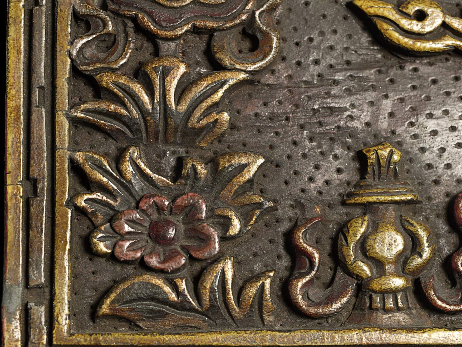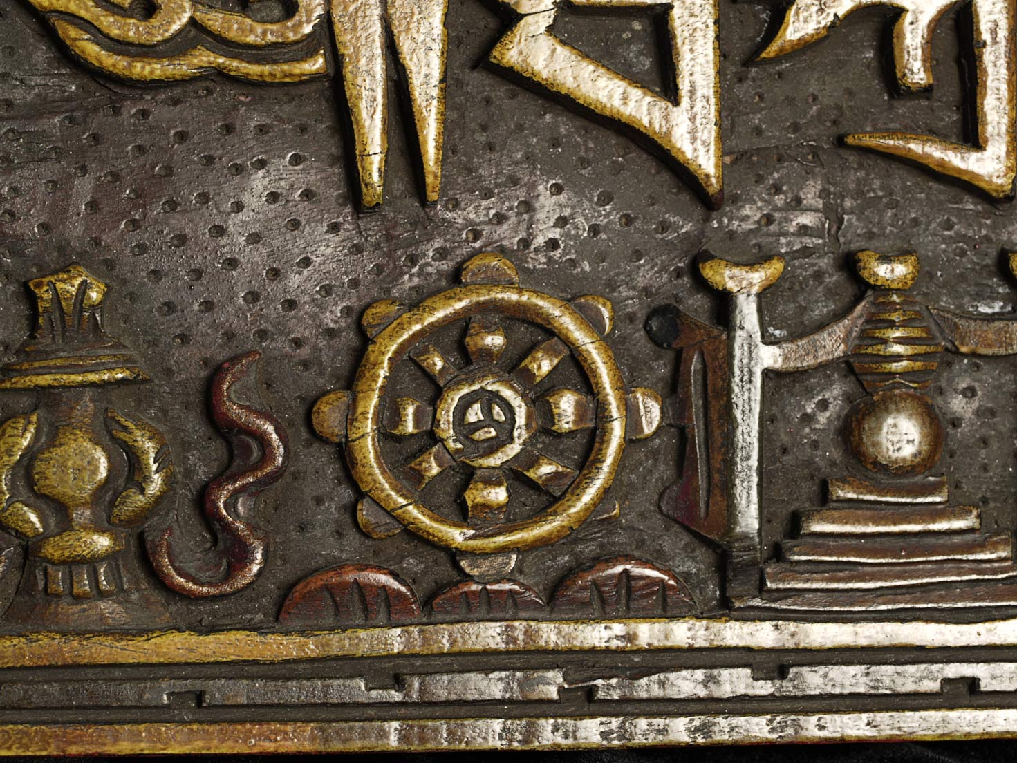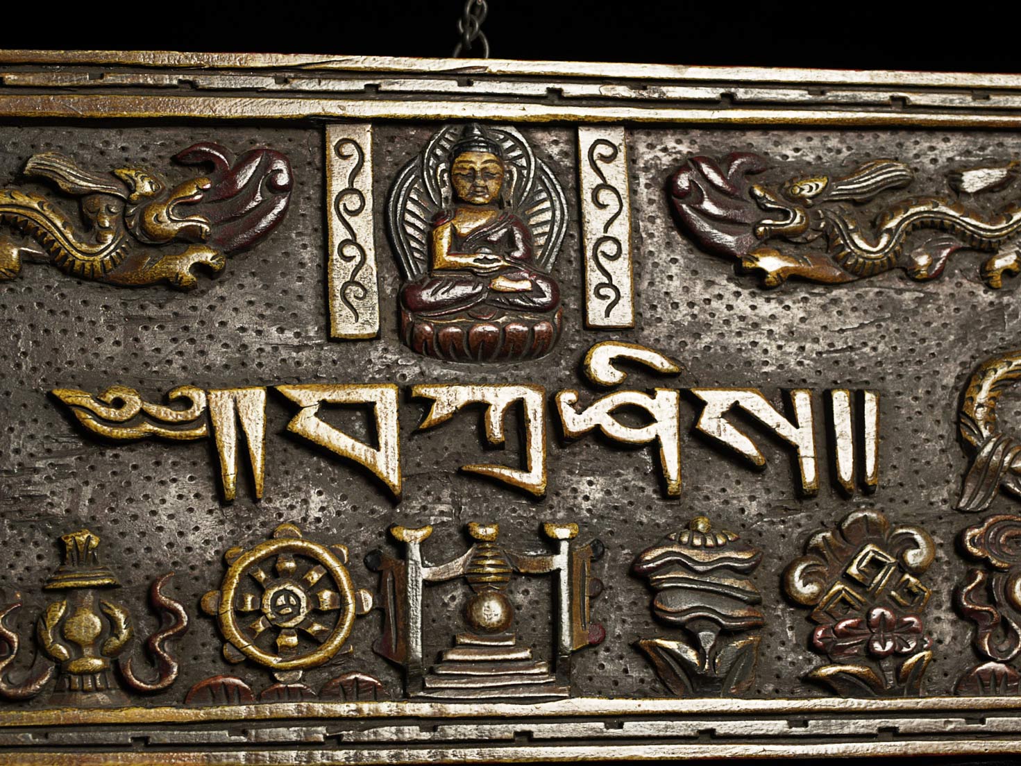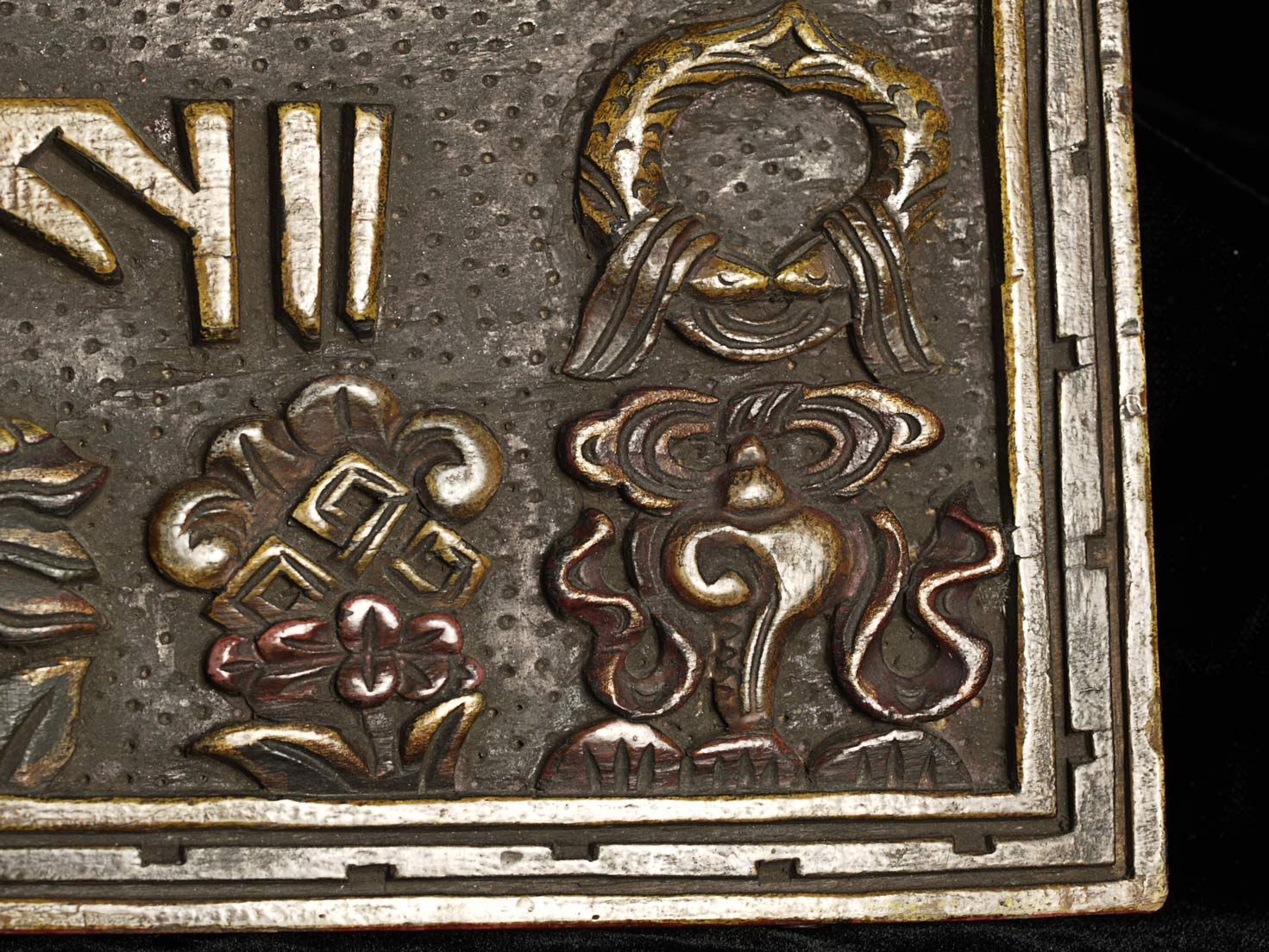 Vintage wooden Buddhist plaque, approximately 7 3/4" x 16 1/2", 1" thick.